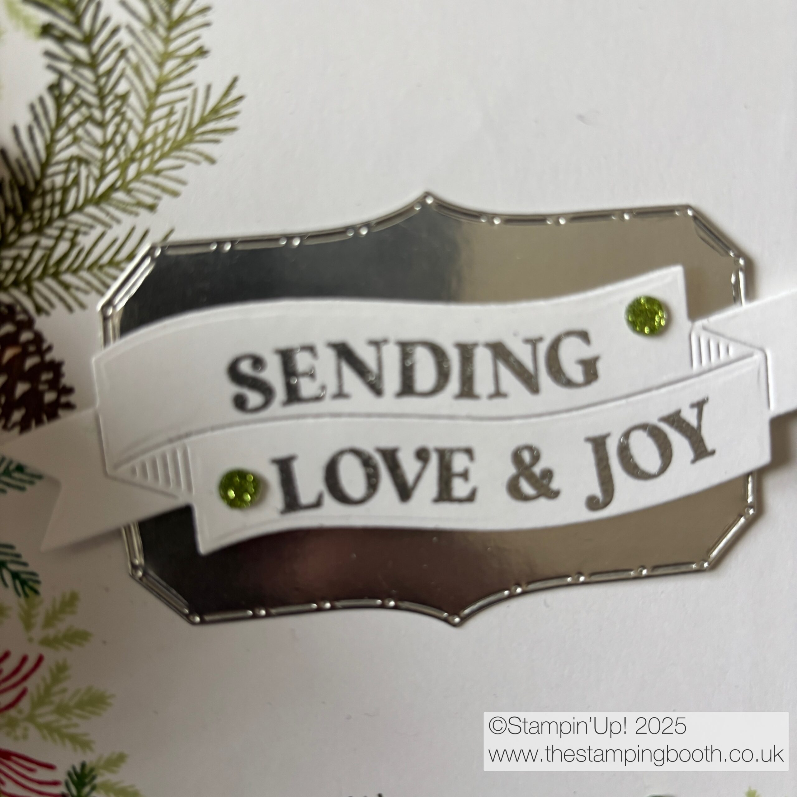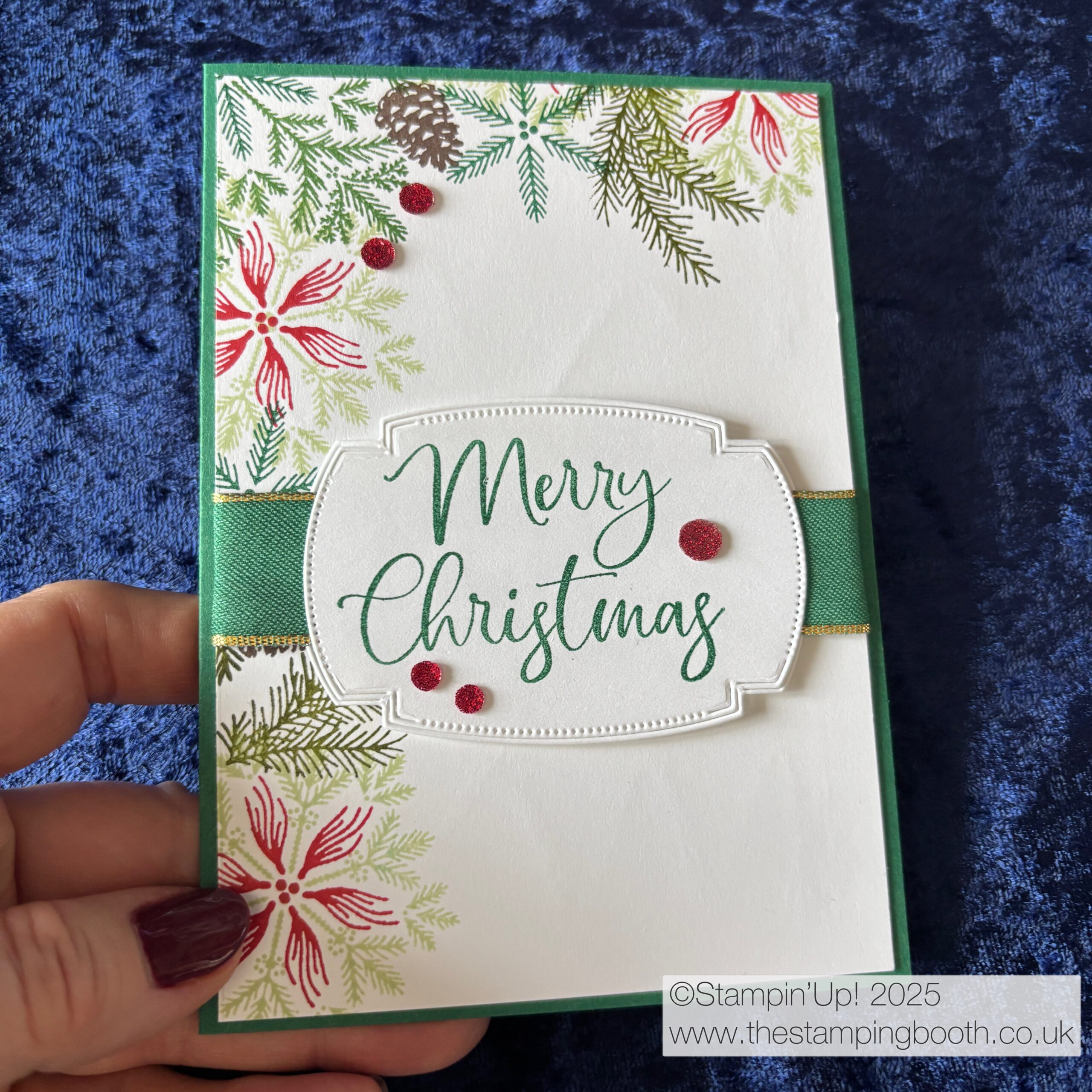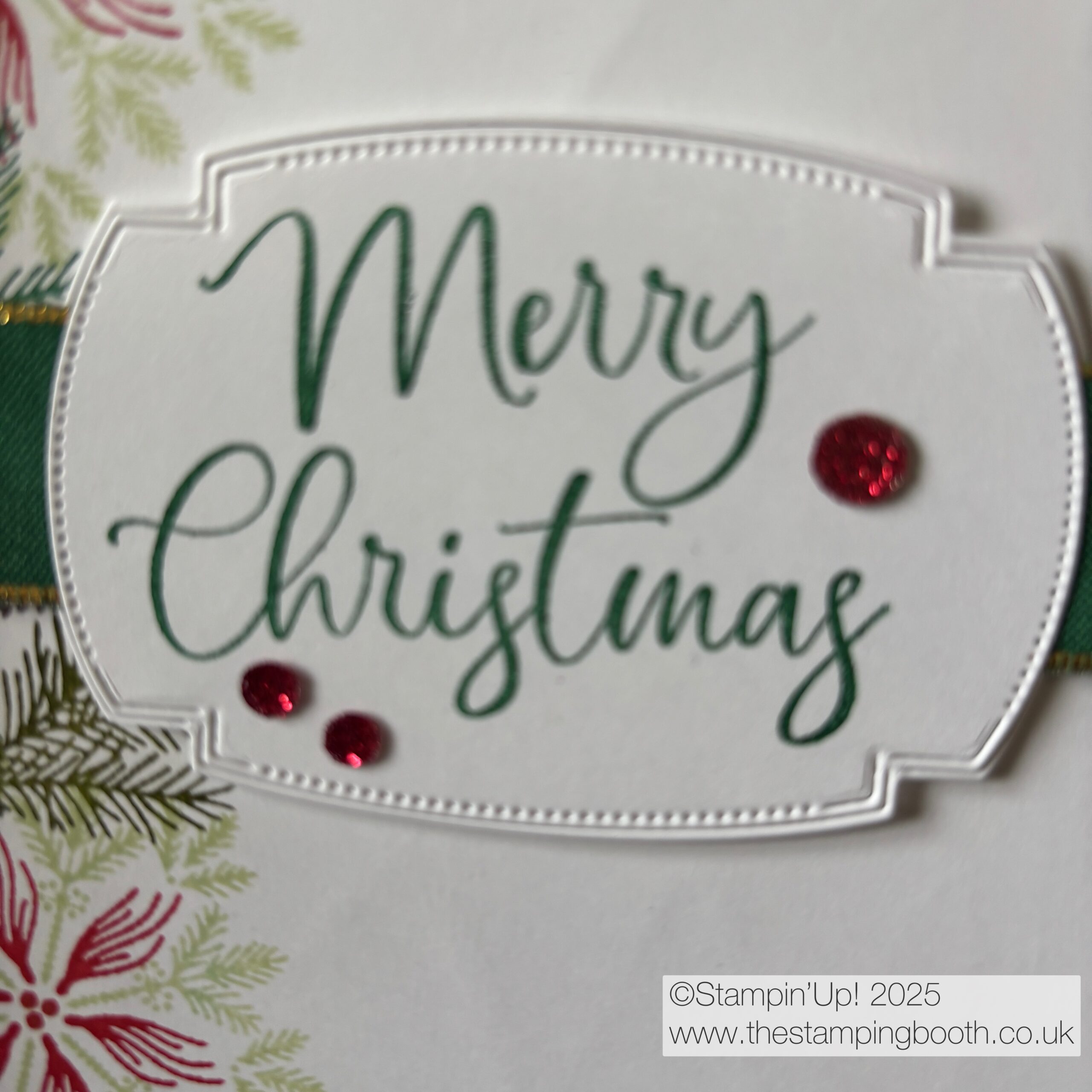 So, for this bloghop I’ve used the Delicate Pines photopolymer stamp set, the Traditional Labels stamps and dies and the Merry Christmas stamp set.